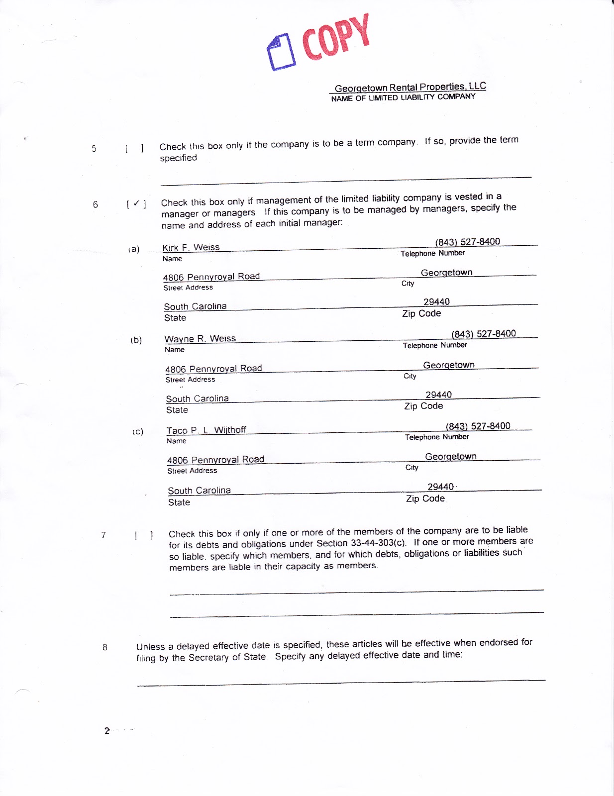 "The Board has considered your complaint and has found it to be without merit. There is nothing in our governing documents or in South Carolina law that establishes the need for a corporate resolution in order to establish who may cast a ballot as a representative when more than one owner is involved in a property (or multiple properties). Mr. Wijthoff's stake in ownership of the Georgetown Rental Properties has been investigated and the results were found satisfactory to the Secretary and to the Board. Mr. Withoff has cast ballots on behalf of Georgetown Rental Properties for many years without complaint or dispute. This was done through the tenure of multiple Secretaries, all of whom took their duties to ensure a fair election seriously. Until the Board receives correspondence from another owner in Georgetown Rental Properties disputing Mr. Wijthoff's right to cast ballots on its behalf, the matter is considered closed by the Board of Directors of the WPA."